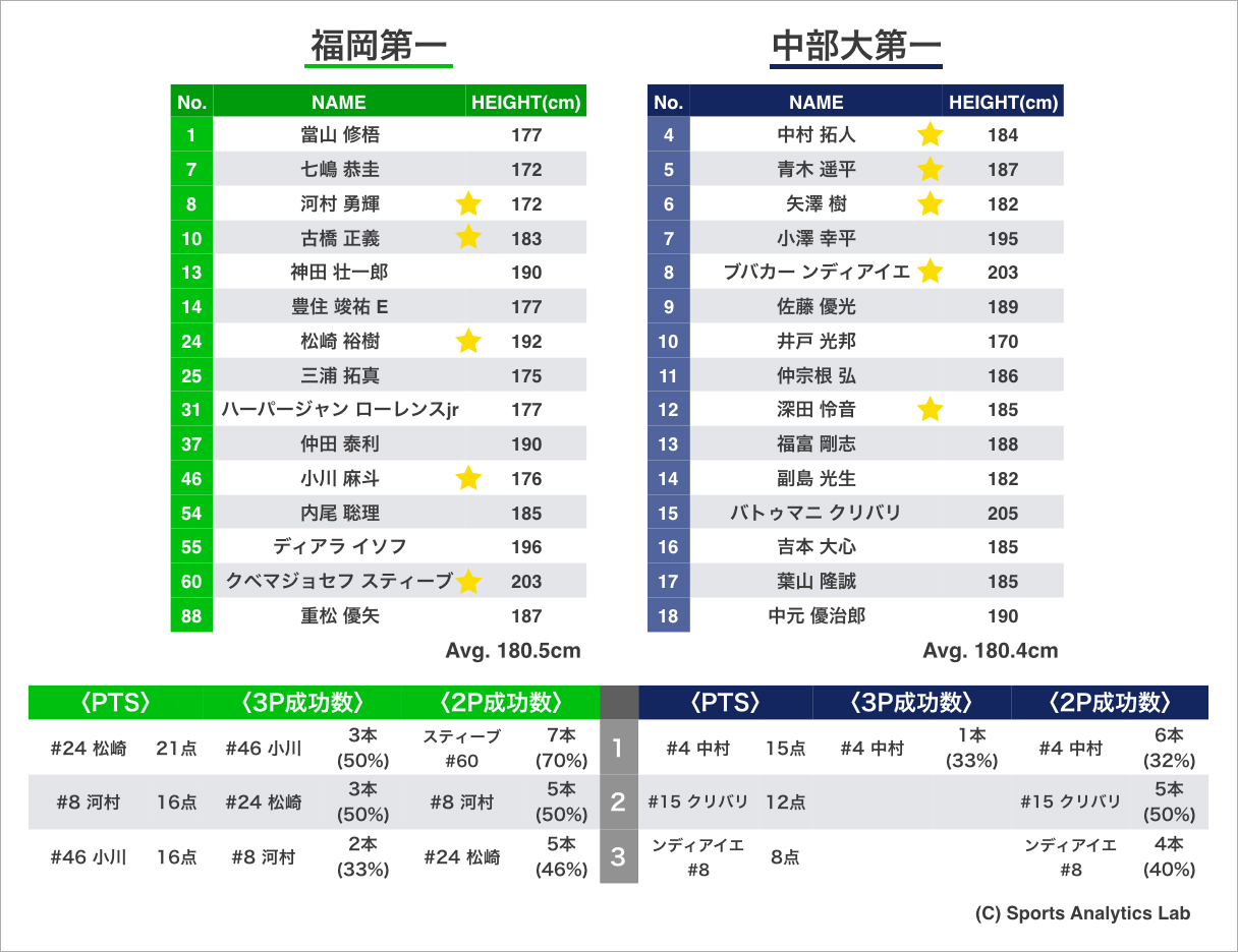 平均身長はほぼ同じ。スタメンの平均身長は福岡第一は185.2cm、中部大第一が188.2cmと3cm上回りました。スティーブ選手(#60)が2P成功数でリーダーなのにも関わらず、得点上位者に上がってこない福岡第一は興味深いです。中部大第一は、オンザコート1で同時に出場できないクリバリ選手(#15)とンディアイエ選手(#8)が得点上位者に上がってしまうのは明らかによくないです。準決勝で29点をとった中村選手(#4)も15点と福岡第一のディフェンス力に攻め手がなくなってしまったと考えられます。