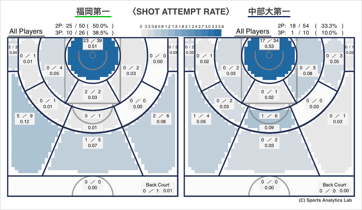 FIRE”と表現したりしますが、まさに福岡第一のほうが燃えています。左ウィングが5/9(55.6%)は素晴らしいです。ゴール下も両チーム同じ色ですが、福岡第一が9%上回っております。