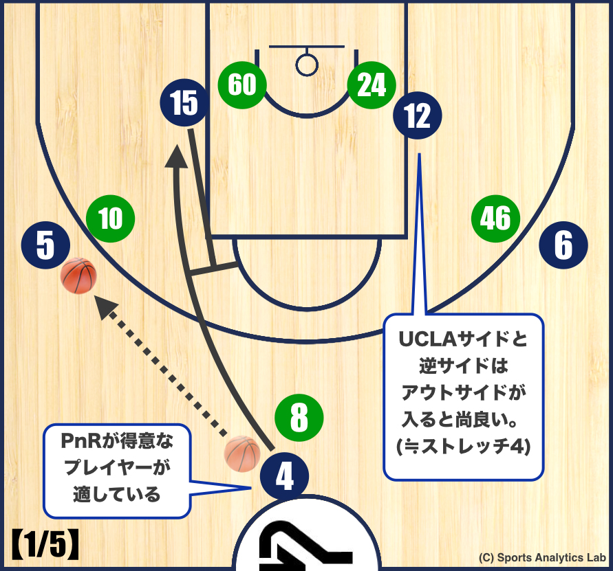 福岡第一高校相手に決めたセットオフェンスです。最後のトップでのピック&ロール(PnR)で中村選手(#4)がアタックしました。簡単かつスペーシングも◎のセットです。ドライブ、PnRができ、アウトサイドシュートもある中村選手(#4)を活かせます。ただ、中村選手(#4)に限らず、PnRが上手いガードなら誰でも使えるものです。