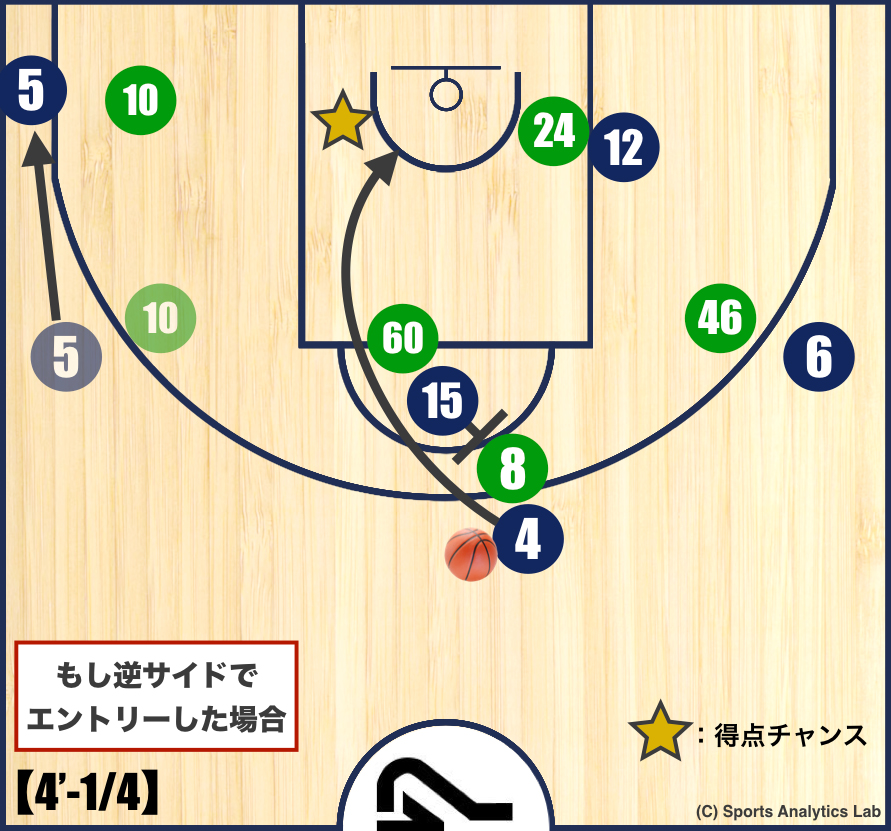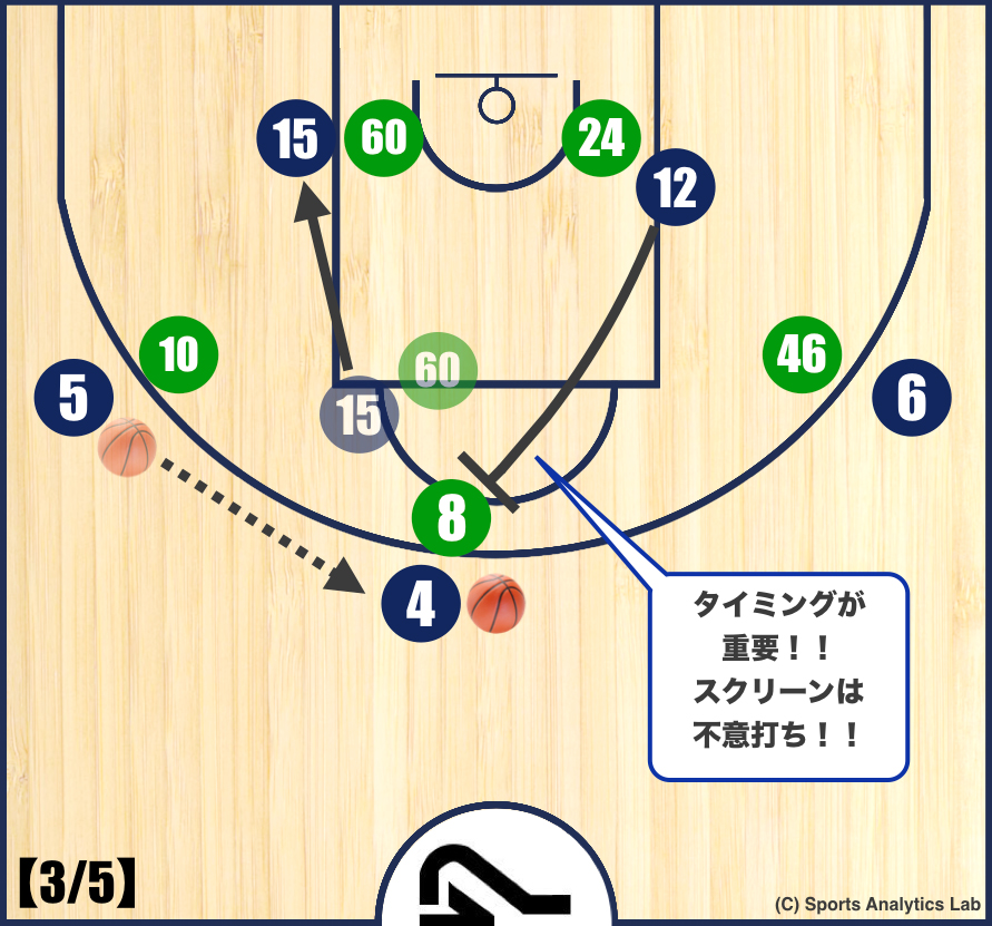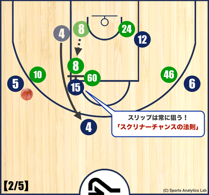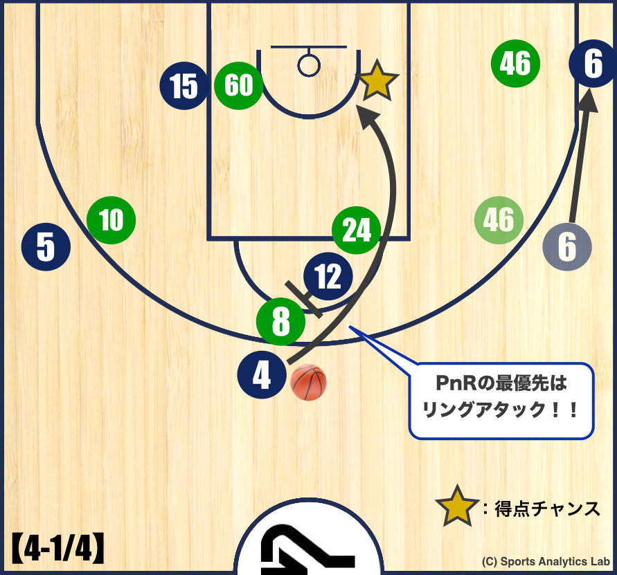 【4’-1/5】このようにPnRの場面でクリバリ選手(#15)がスクリナーになります。