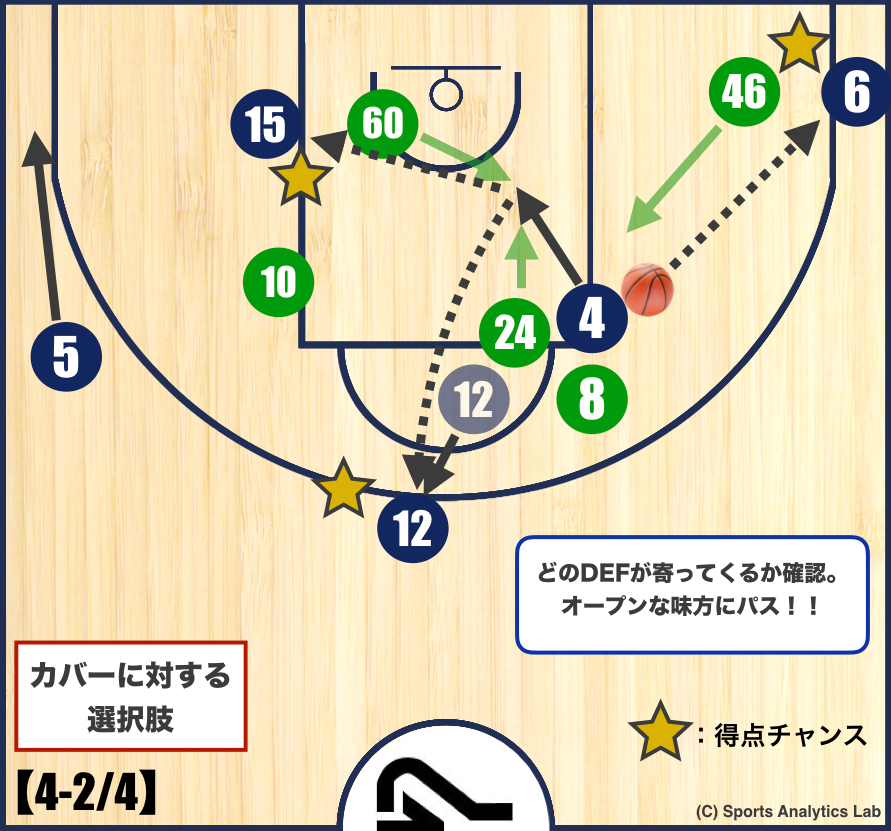 中村選手(#4)のペネトレイトに対してカバーがきた場合の選択がこちらです。オーソドックスなパスの選択肢は3つです。ハンドリング能力と視野と状況次第ですが、逆サイドの青木選手(#5)に飛ばすこともできるかもしれません。