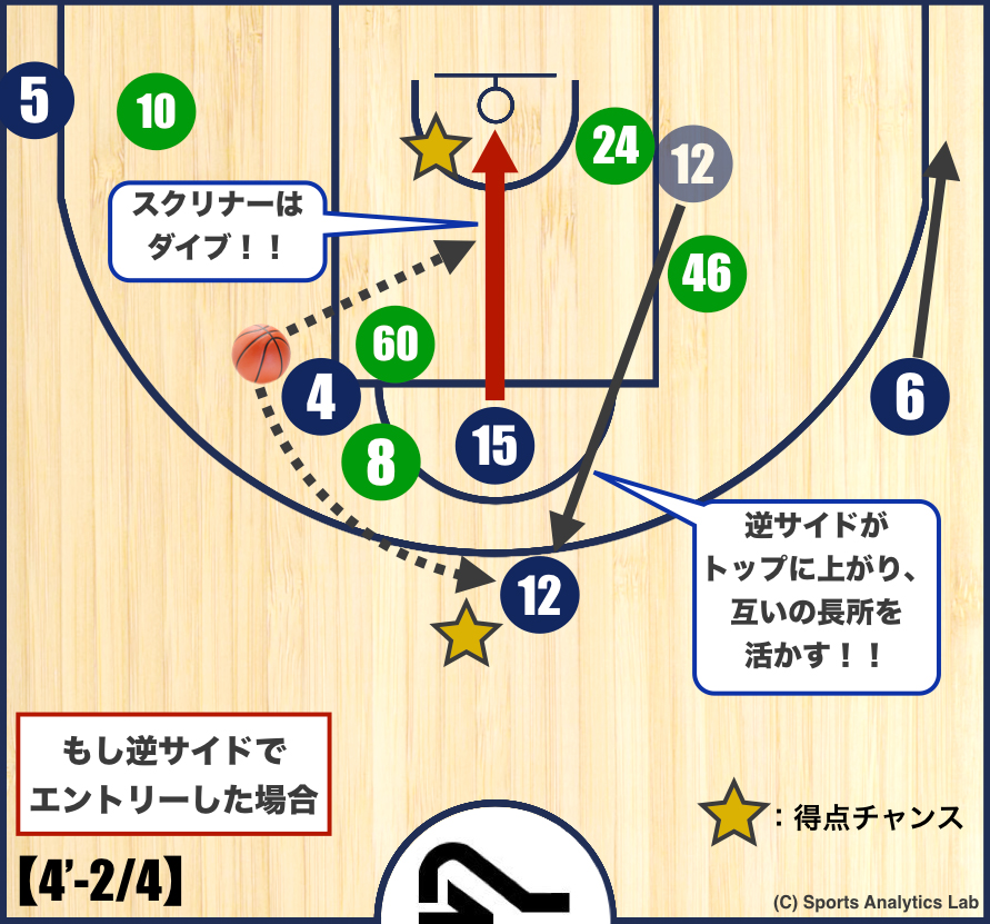 2. 再びクリバリ選手(#15)がスクリーンをセットし、中村選手(#4)はトップに上がります。DEFの対応をよく見て、スリップが狙えたら狙います。「スクリナーチャンスの法則」です。