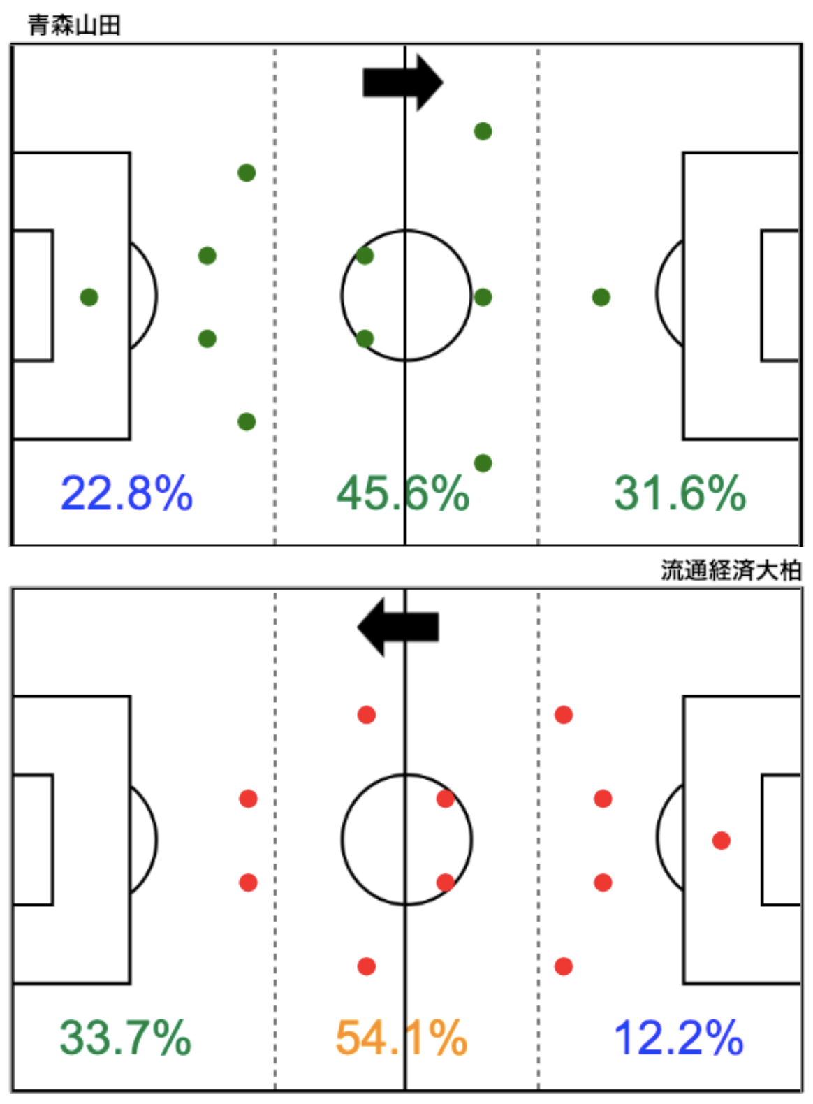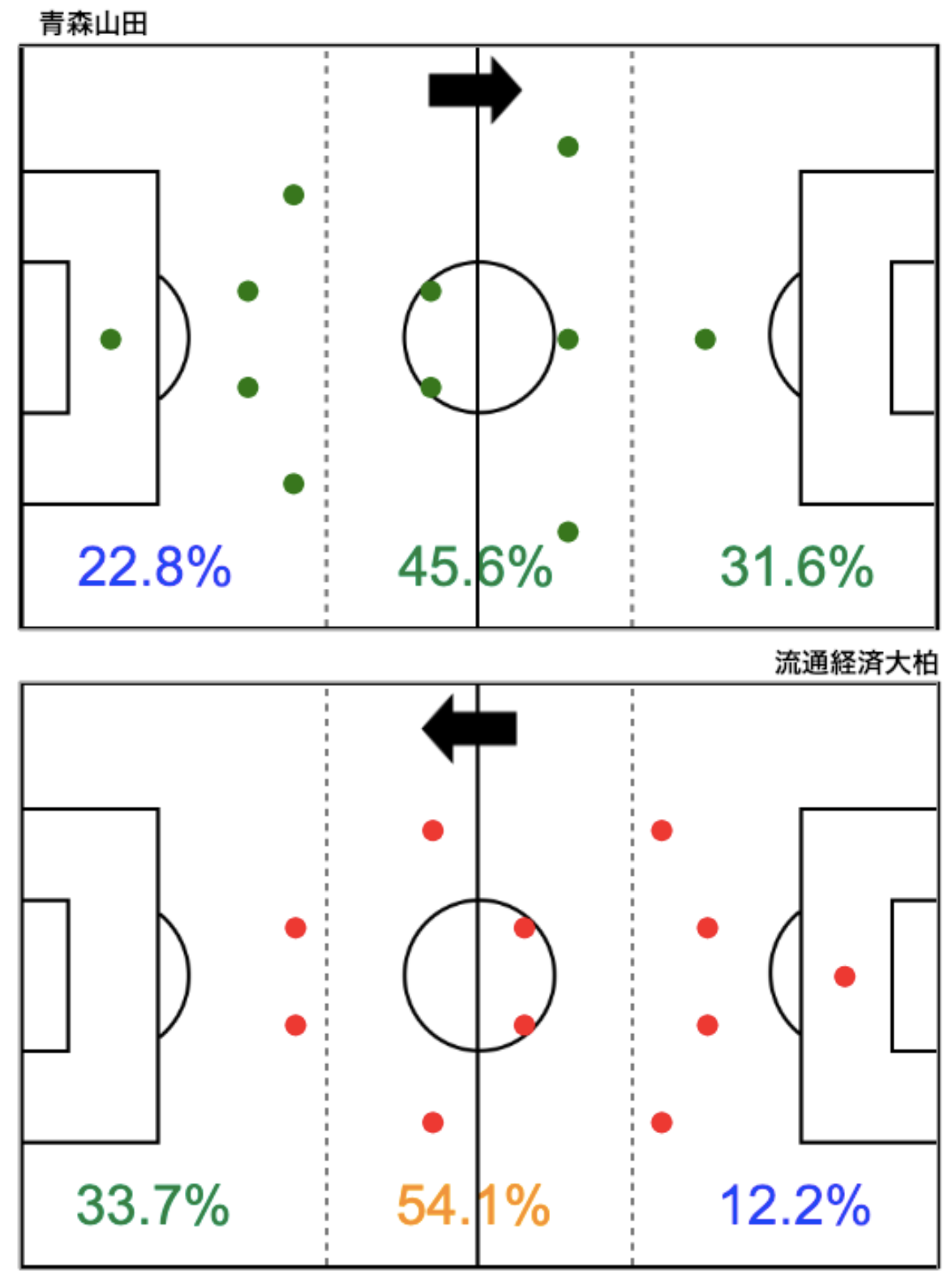 右の図の円グラフは自陣でのプレー比率を表しており、この試合ではロングパスの比率が最も大きいものの、タテパス、ドリブルも使われていたことがわかります。棒グラフは攻撃位置の比率を表しており、右サイドの攻撃が多かったことがわかります。