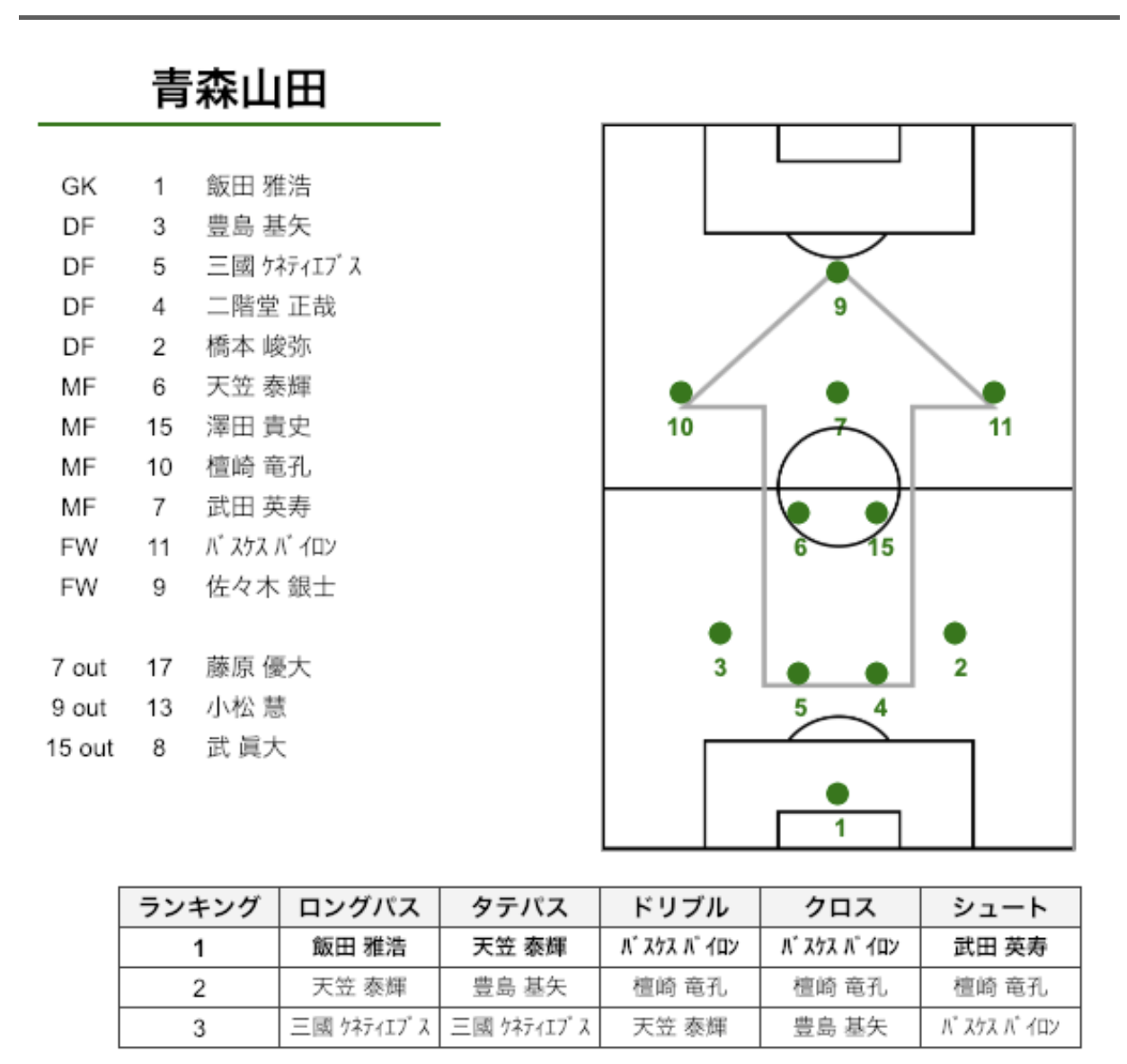 この試合で青森山田は、自陣ではロングパスを中心にしながらも、タテパスも交えてボールを運び、右サイドから多く攻撃を仕掛けていました。天笠選手がタテパスできっかけを作り、バスケス選手がドリブルで仕掛け、クロスまで持っていくようなプレーが多かったです。青森山田は、右サイドから2得点、最後にカウンターで1得点し、勝利した試合でした。