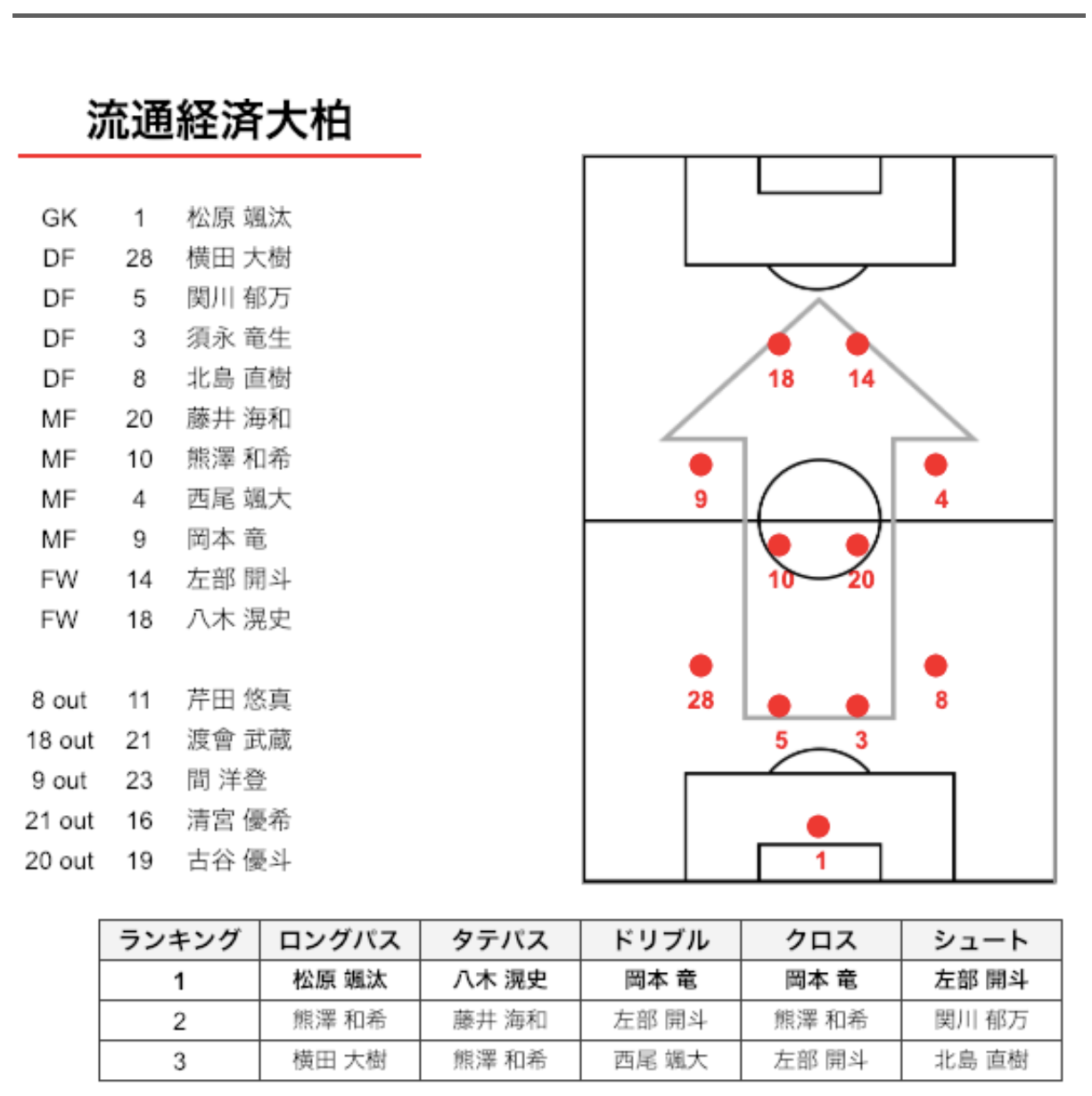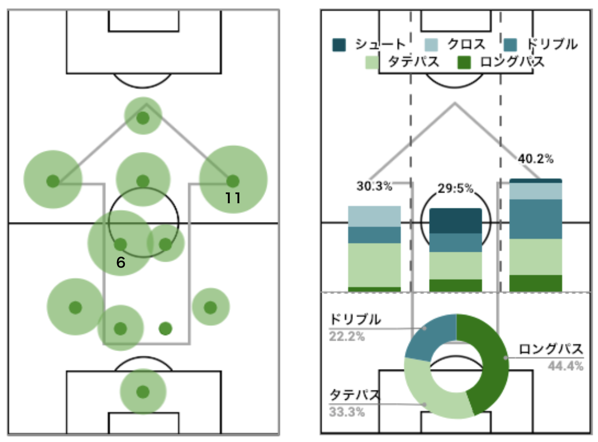 図の円の大きさは、プレーの多さを表しており、11番のバスケス選手、6番の天笠選手が比較的大きいです。この2人が攻撃に多く絡んでいたことが読み取れます。