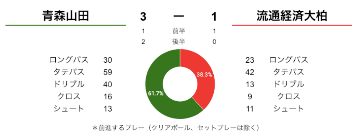 青森山田が攻め、流通経済大柏が守る展開が多い試合。流通経済大柏がコーナーキックから先制したものの、その後青森山田が3得点と逆転勝利した試合。