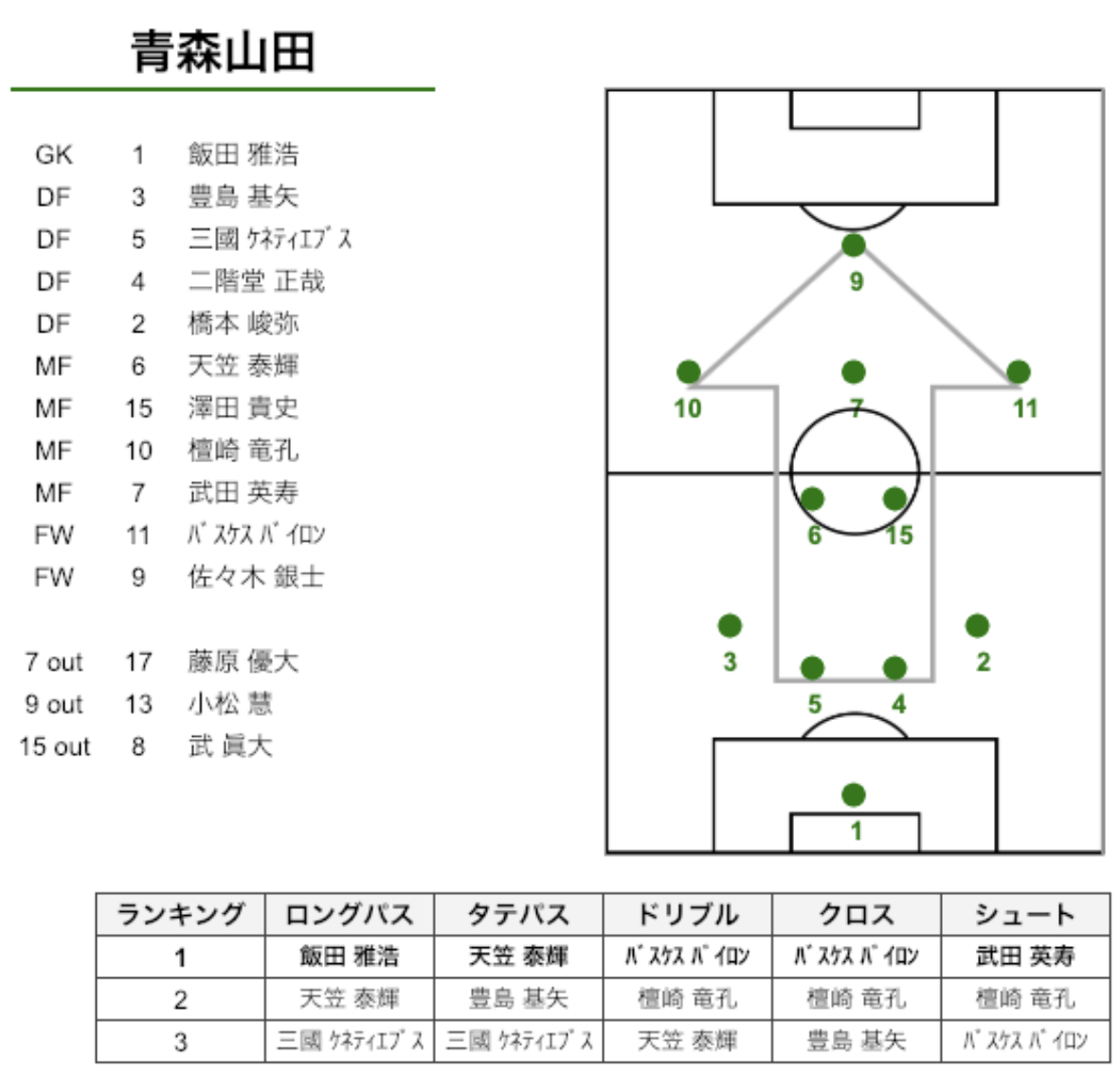ドリブル、クロスは11番のバスケス選手が最も多く、2番目に10番の檀崎選手。タテパスが最も多かったのは6番の天笠選手。