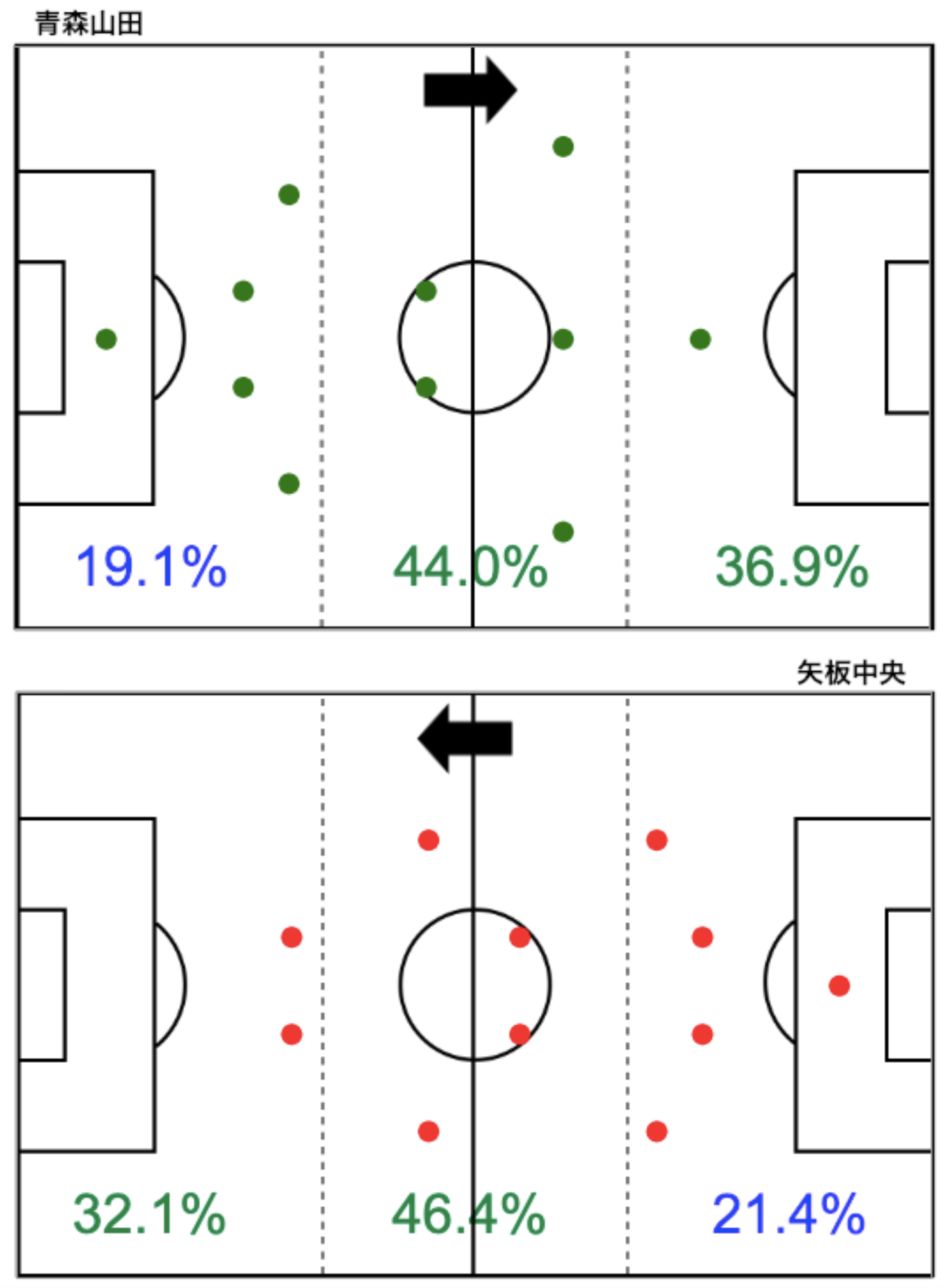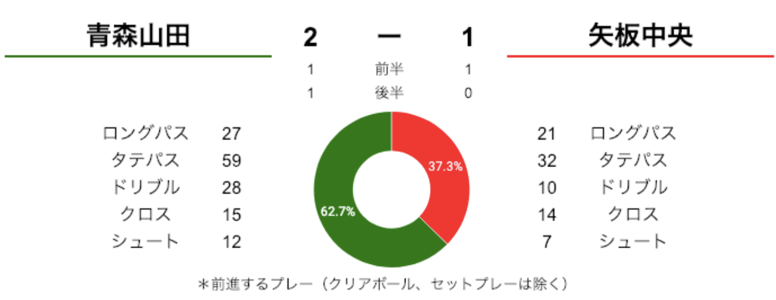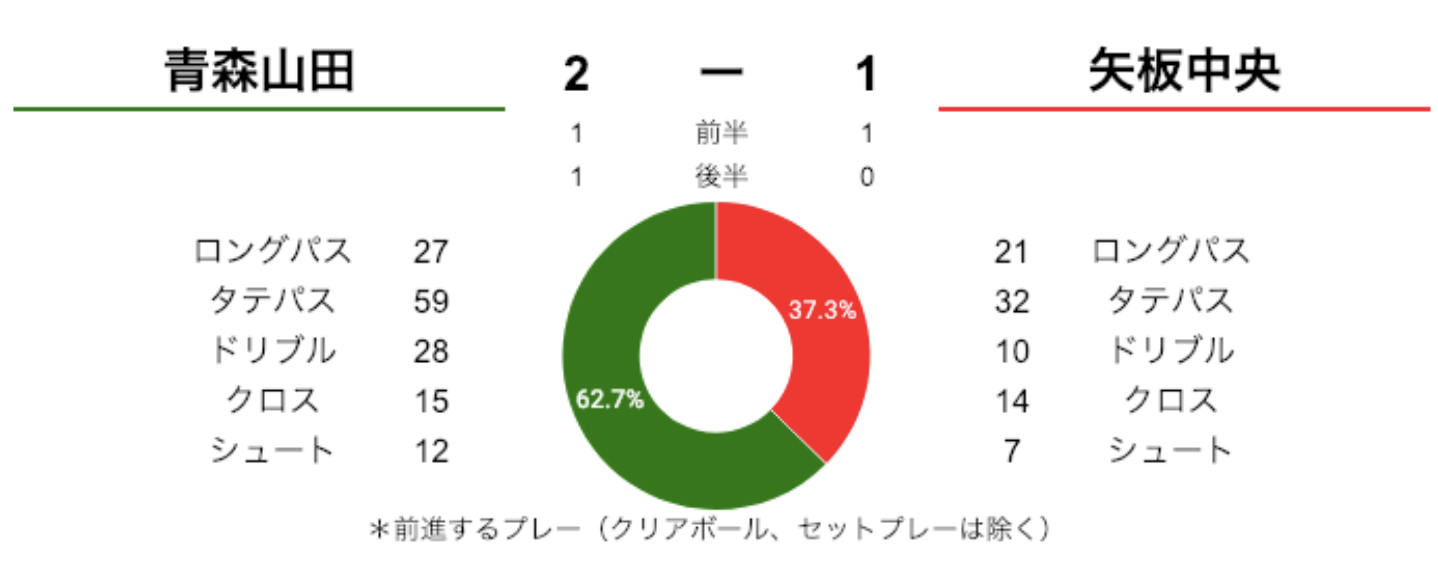 この試合で青森山田は、ロングパス、タテパスを使いながらDF陣から攻撃を組み立て、サイドを起点に攻撃を仕掛けていたことが分かります。特に10番の檀崎選手が位置する左サイドから多くの攻撃を行っていました。矢板中央はその攻撃を受けながらも、安定した守備で流れの中からの得点を与えず、青森山田ゴールに迫っていました。最終的には青森山田が、得たスローインのチャンスを多く生かし、勝利につなげた試合でした。