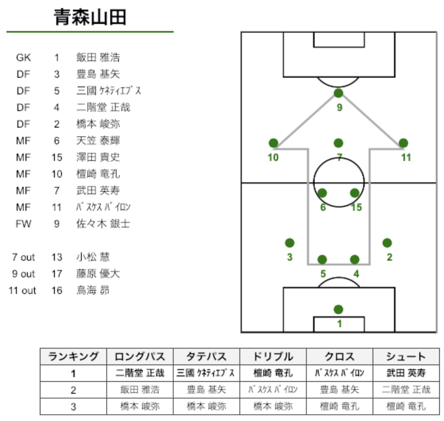 ドリブルは10番の檀崎選手が最も多く、2番目に11番のバスケス選手。タテパスが最も多い選手が、DFで5番の三國選手というのも特徴的。