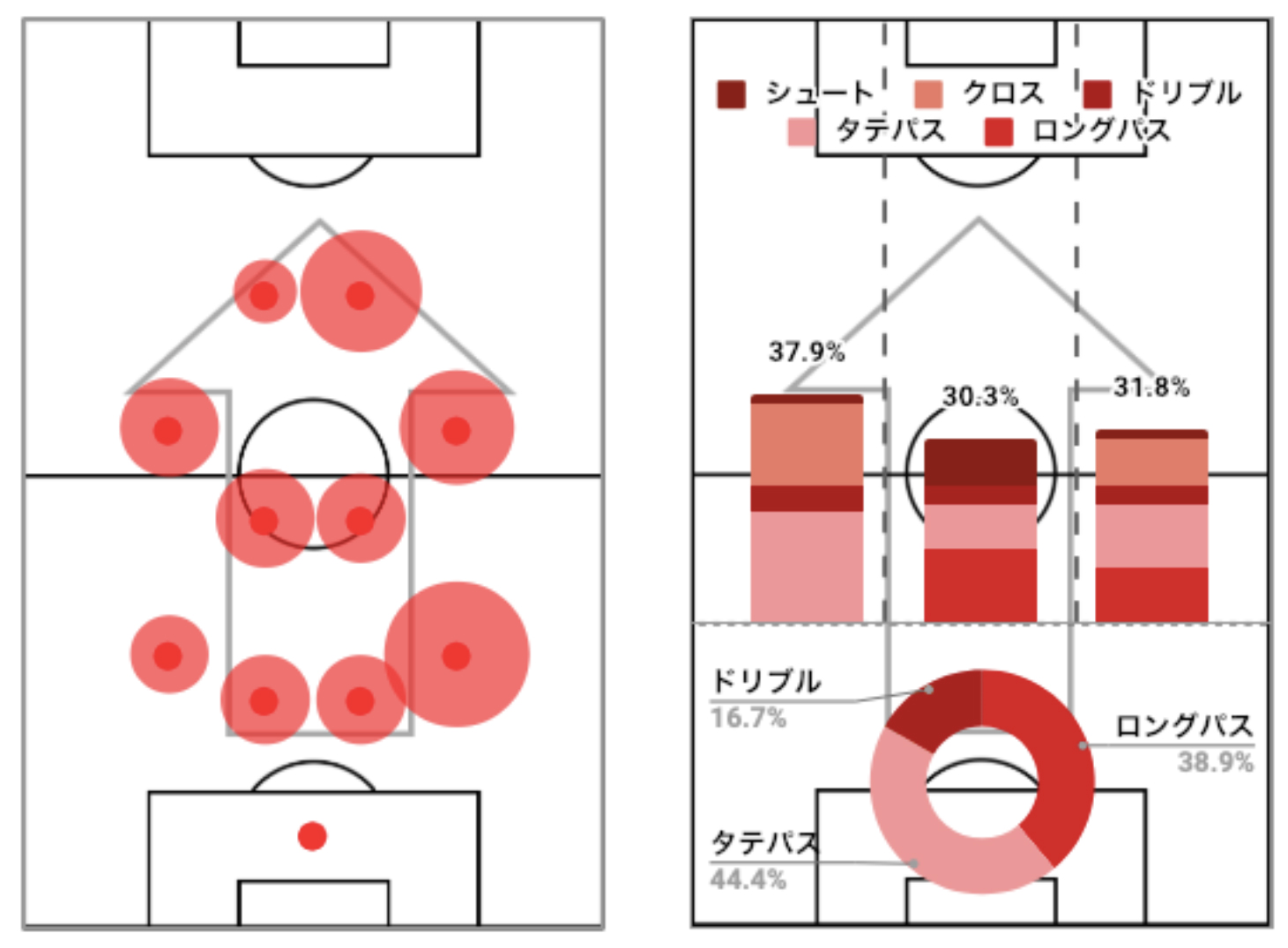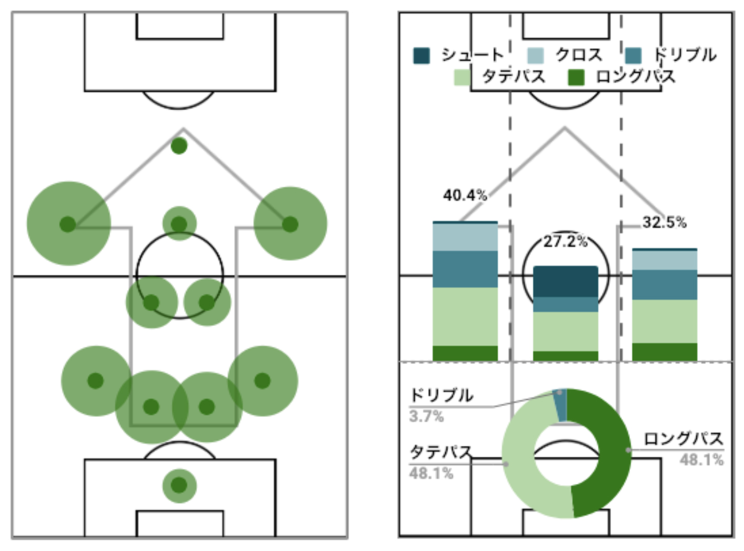 右の図の円グラフは自陣でのプレー比率を表しており、この試合ではタテパス、ロングパスが48.1%と同じ値でした。棒グラフは攻撃位置の比率を表しており、中央と比較して、左右の攻撃が多いことが分かります。特に左は40.4%と最も大きい値を示しました。