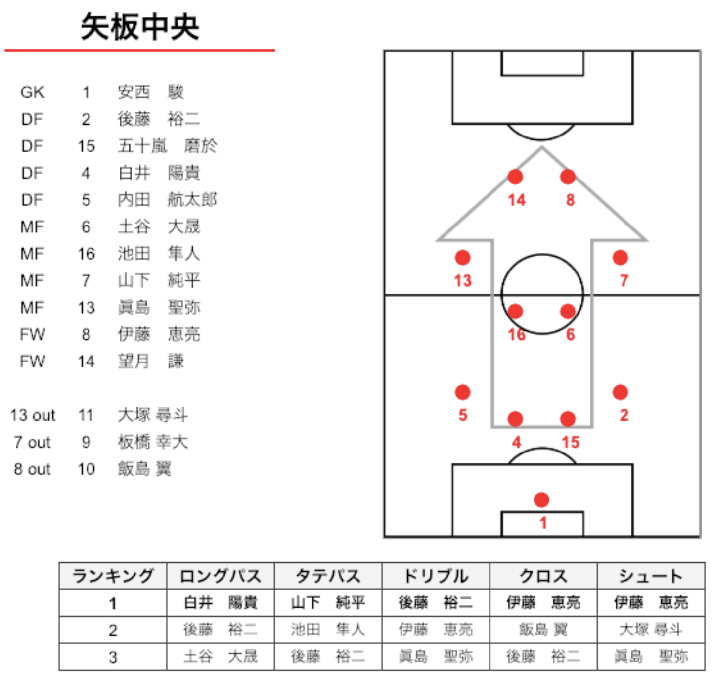 以上は、SPLYZATeamsを使って、前進するプレー(ロングパス、タテパス、ドリブル、クロス、シュート)と、プレーが起きた位置、プレイヤーにタグをつけ、その集計結果を使って作成されたレポートです。(セットプレーと、クリアボールなど、味方に通す意図が汲み取れないプレーは集計されていません)
